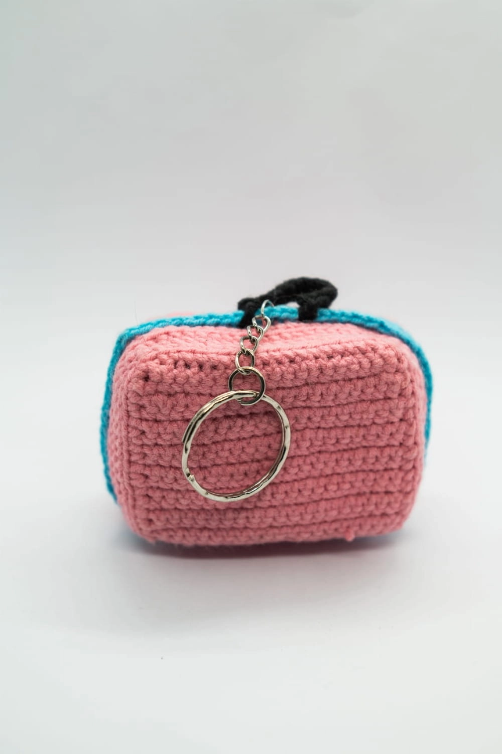 Ręcznie szydełkowany brelok w kształcie różowo-niebieskiej walizki to kolorowy i praktyczny dodatek. Wykonany ręcznie w Polsce, świetnie sprawdza się przy kluczach, torbie lub plecaku.