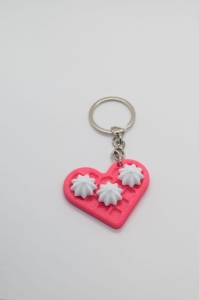 Brelok wykonany w technologii druku 3D z PLA, przedstawiający różowy wafel w kształcie serca z białą „bitą śmietaną”.