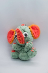 Ten zielono-pomarańczowy słoń na szydełku to kolorowy brelok handmade, który od razu przyciąga wzrok i poprawia humor