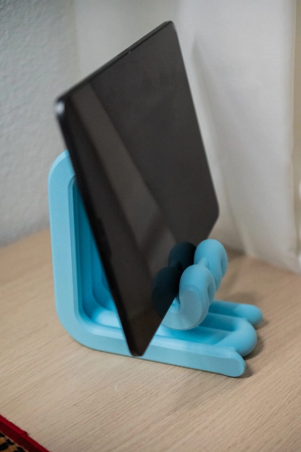 Stabilny stojak na telefon lub tablet wykonany w technologii druku 3D z materiału PLA. Prosta, solidna konstrukcja bez regulacji, idealna do codziennego użytku.