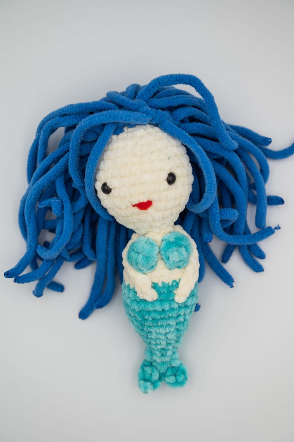 Syrena z niebieskimi włosami, ręcznie zrobiona z włóczki na szydełku