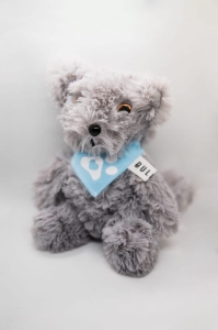 Szary Pupil w Niebieskiej Chustce, pies, rękodzieło