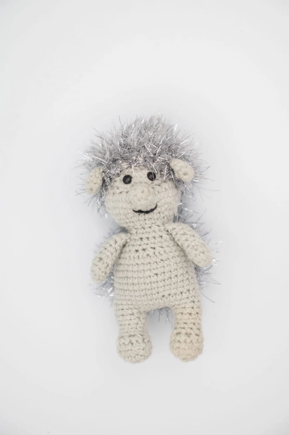 Szary jeż z połyskującymi igłami – ręcznie wykonana dekoracja z włóczki