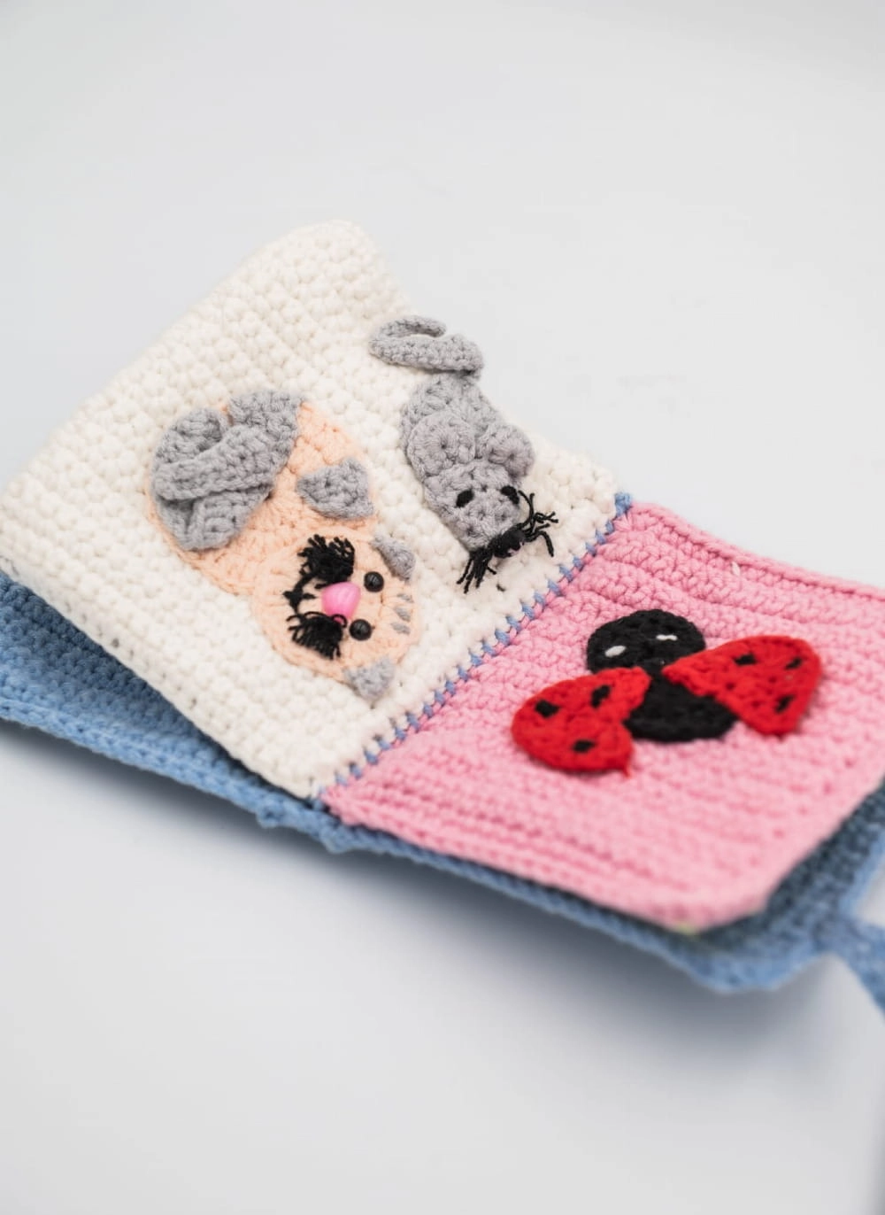 Szydełkowa książeczka sensoryczna – pies, kot i mysz, biedronka, żaba