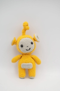 Ręcznie wykonana, szydełkowa żółta postać z charakterystyczną antenką i jasnym panelem na brzuszku. Miękka, przyjazna forma o bajkowym charakterze.