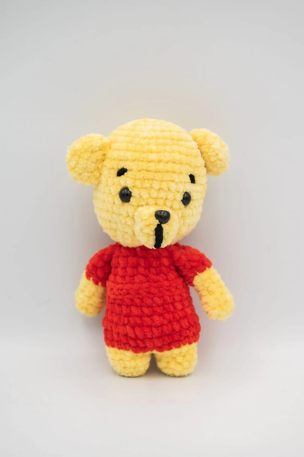 Mały, szydełkowy miś wykonany ręcznie z dbałością o każdy detal. Utrzymany w ciepłym, miodowym odcieniu żółci i ubrany w prostą czerwoną koszulkę, przyciąga uwagę swoją klasyczną, ponadczasową formą.