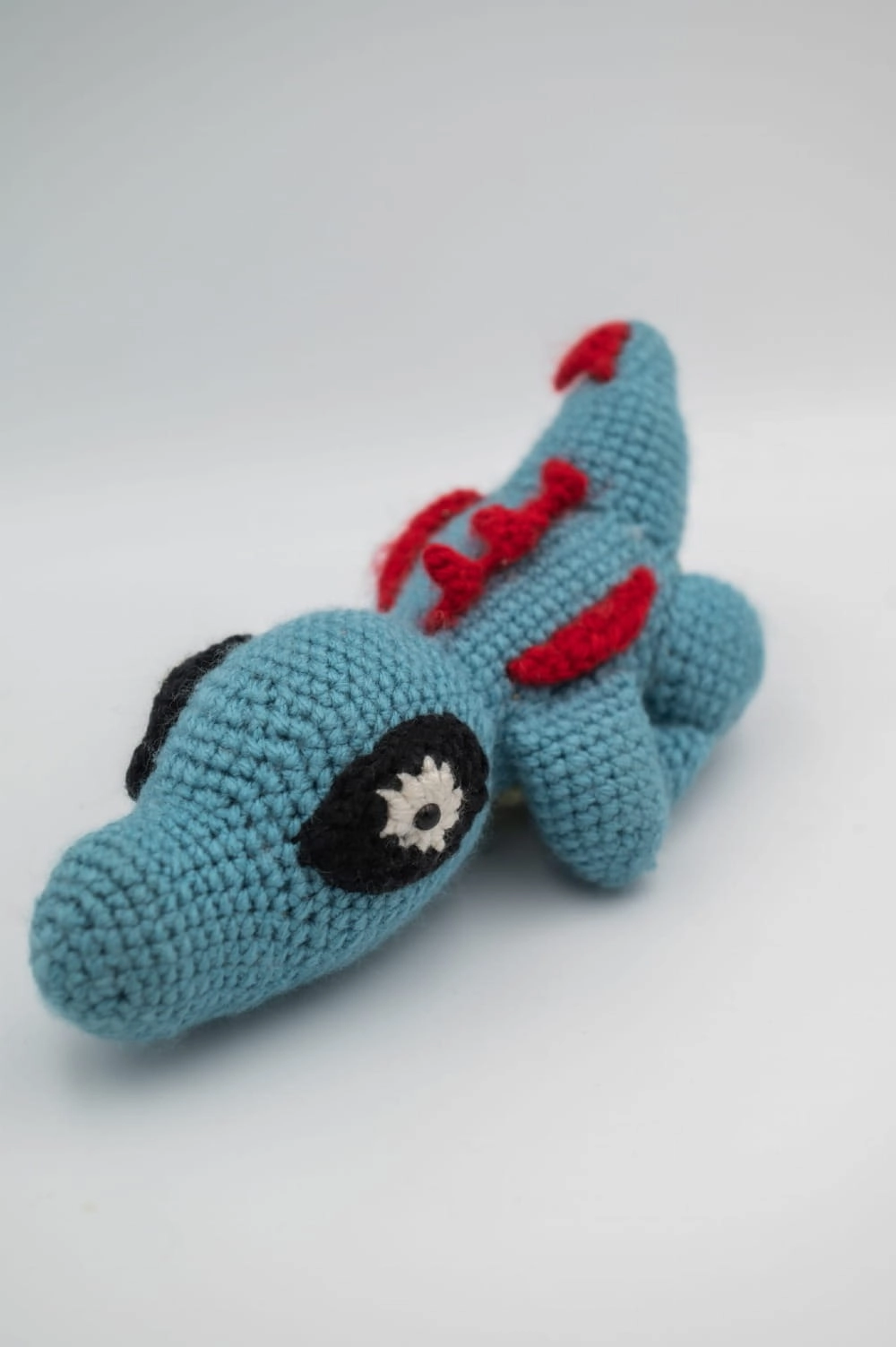 Szydełkowy smok w niebiesko-czerwonej kolorystyce – rękodzieło