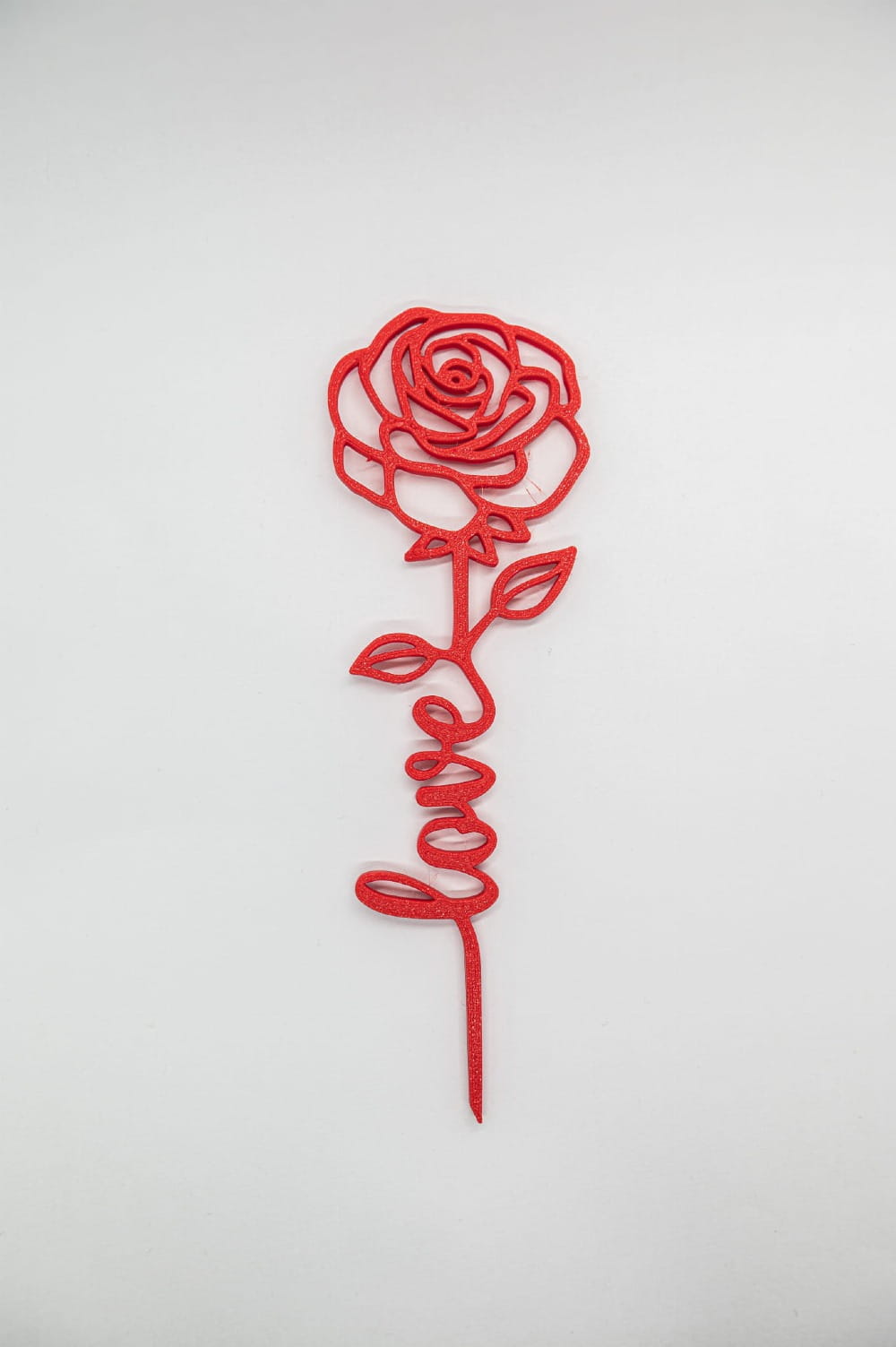 Czerwony topper na tort w kształcie róży z napisem Love, wykonany z trwałego materiału PLA. Romantyczna dekoracja idealna na walentynki, śluby i rocznice.