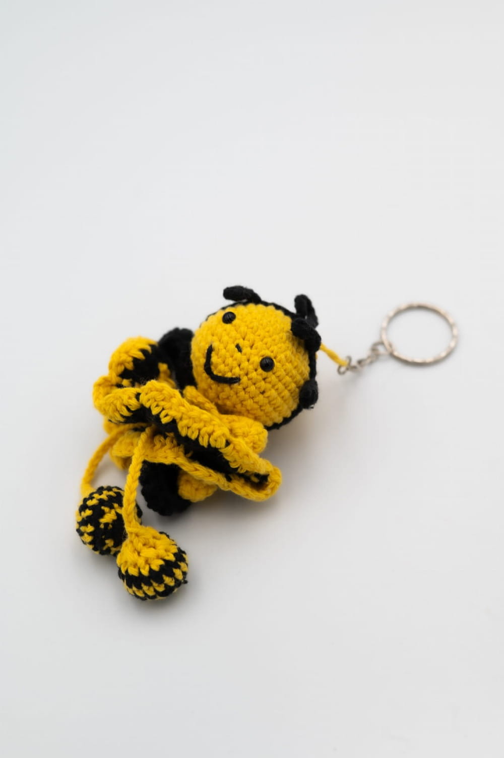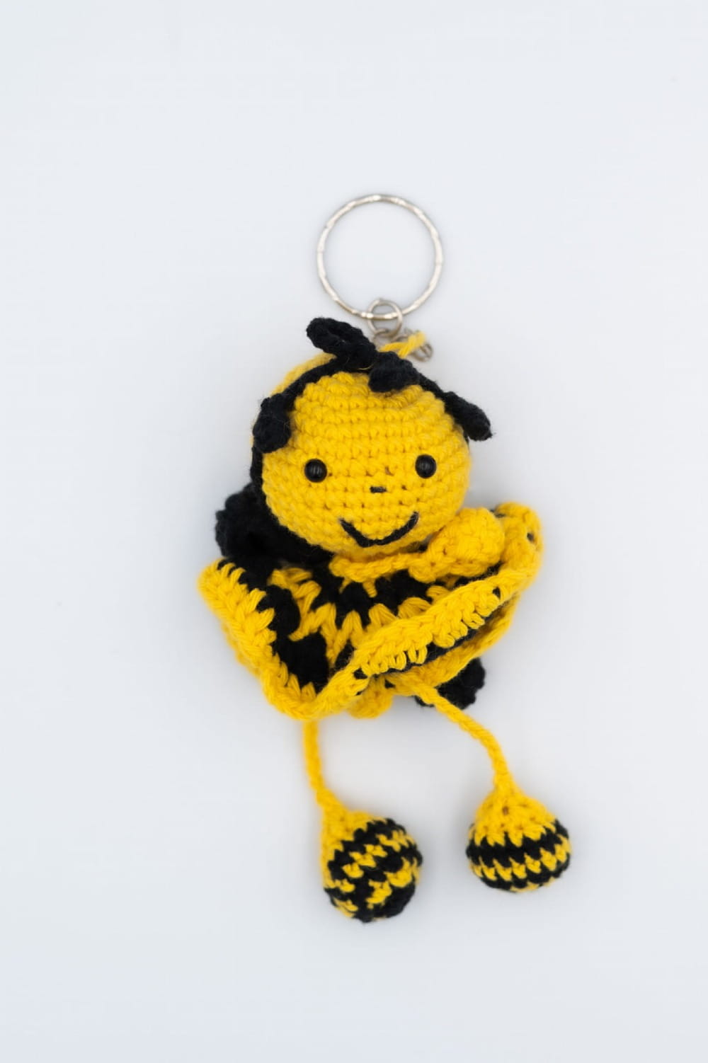 Ręcznie wykonany w Polsce brelok – pszczoła, wykonana na szydełku z włóczki. Wyposażona w bezpieczne oczka. Oryginalny dodatek do kluczy lub torby.