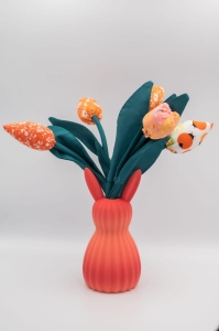 Ten unikatowy wazon w formie zająca został wykonany w druk 3D w odcieniach pomarańczowo-czerwonych, co nadaje mu nowoczesnego, dekoracyjnego charakteru. W środku znajduje się komplet 5 ręcznie szytych kwiatów, wykonanych z tkanin w pomarańczowym odcieniu, każdy w unikatowy wzór: kwiatki i biedronki.