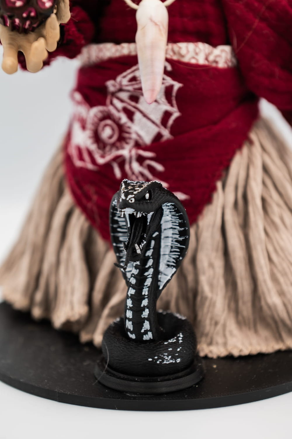 W dłoni trzyma czarne, ręcznie malowane jabłko o magicznym wyglądzie — ozdobione czerwonymi połyskującymi elementami, które nadają mu aurę zagrożenia. U jej stóp czai się trójwymiarowy wąż stworzony w technologii druku 3D, dodający figurce mrocznego uroku.