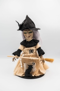 Ręcznie wykonana, klasyczna figurka wiedźmy w czarnym kapeluszu, z miotłą i czarnym kotem. Szyte ubranie, dopracowane szczegóły twarzy i naturalne faktury materiałów nadają jej wyjątkowy charakter.