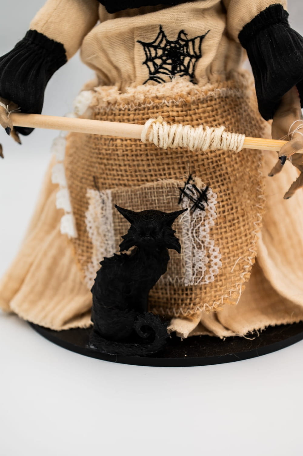 Wiedźma trzyma miotłę, symbol jej magicznych podróży, a u jej boku czai się wierny czarny kot — drukowany w 3D. Połączenie naturalnych tkanin, surowych faktur i subtelnych zdobień daje efekt pięknej, kolekcjonerskiej figurki w klasycznym stylu.