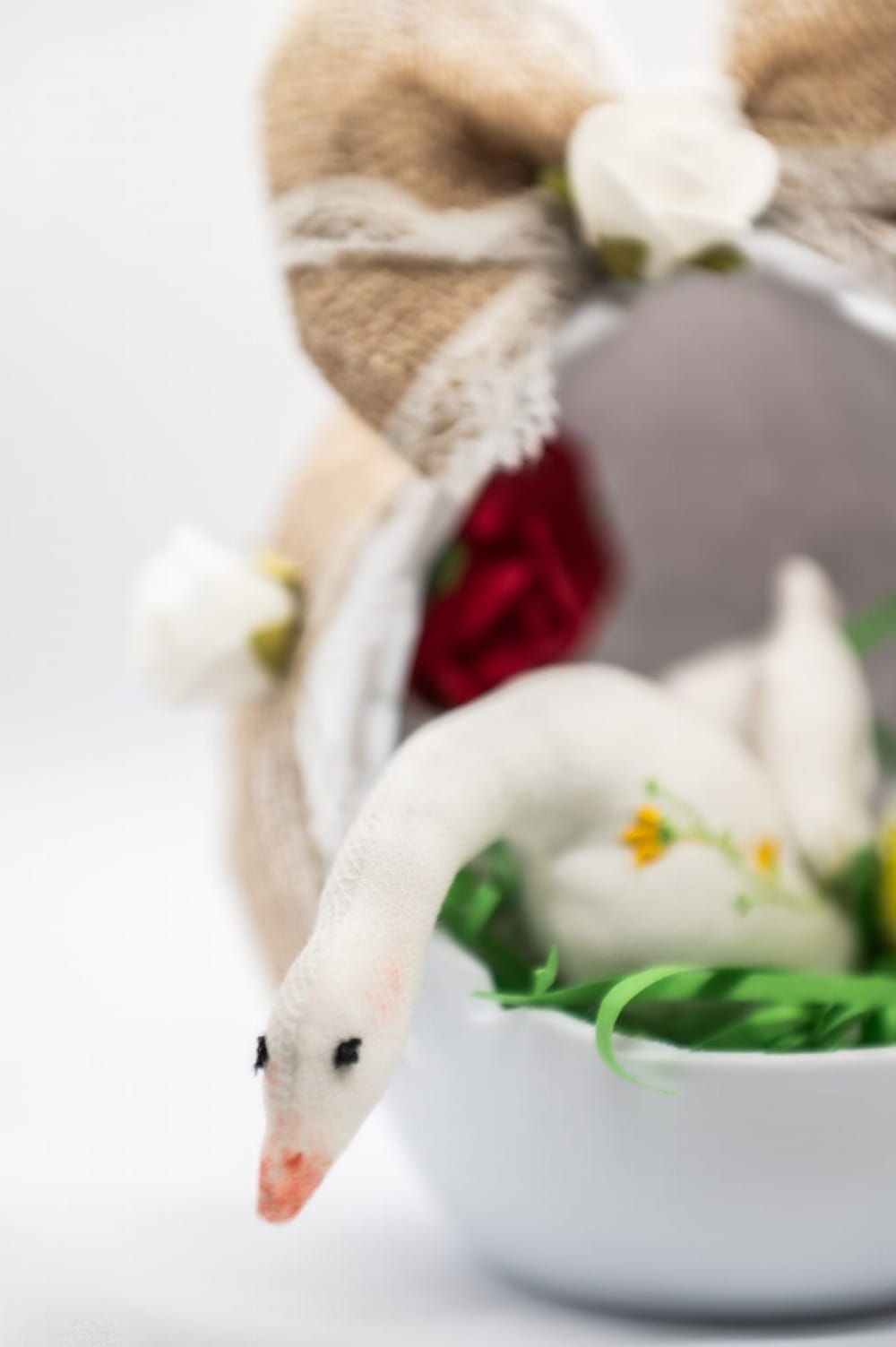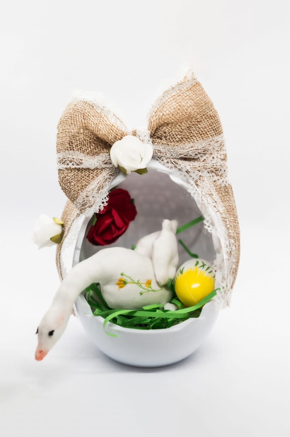 Wielkanocna dekoracja – gąska w ozdobnym jajku z rustykalną kokardą