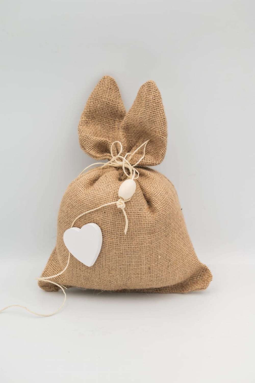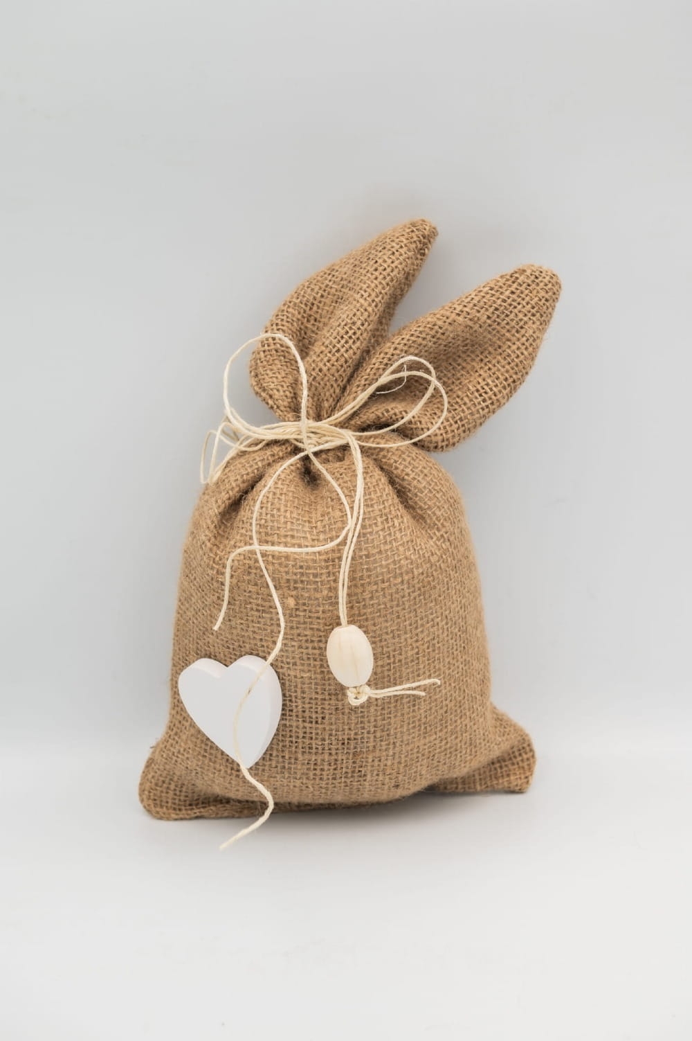 Worek z naturalnej juty w kształcie zająca, z uszami na górze i serduszkiem na przodzie. Idealna dekoracja wielkanocna do domu lub na stół.