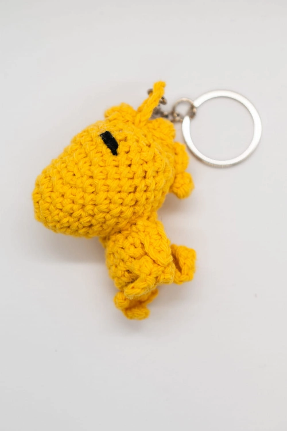Ręcznie szydełkowany brelok w kształcie żółtego dinozaura to zabawny i energetyczny dodatek. Stworzony w Polsce, dodaje charakteru kluczom, torbie lub plecakowi.