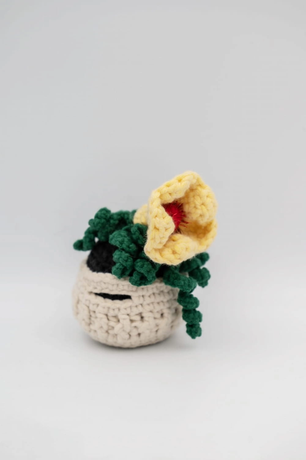 Zwisający zielony kwiatek z żółtym kwiatkiem – ręcznie wykonana dekoracja w doniczce