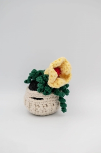 Zielona, zwisająca roślina z żółtym kwiatkiem to ręcznie wykonana w Polsce dekoracja z włóczki. Naturalna forma i kontrastowy akcent kolorystyczny tworzą świeżą, przyciągającą wzrok kompozycję.